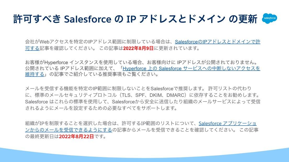 英語版ではありますが、「SalesforceのIPアドレスとドメインで許可する」と「Salesforce アプリケーションからのメールを受信できるようにする」の記事が更新されました。