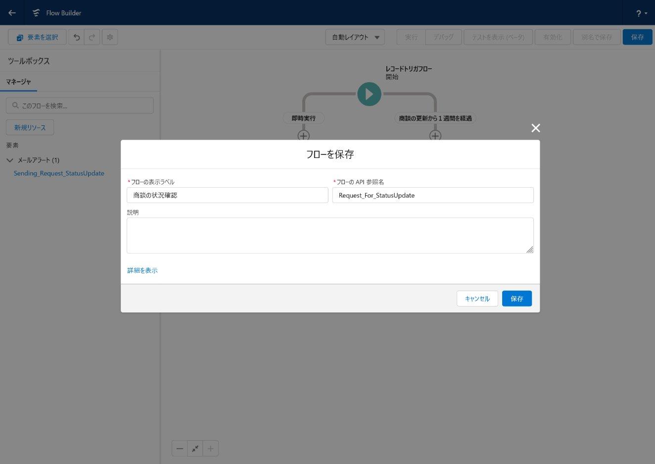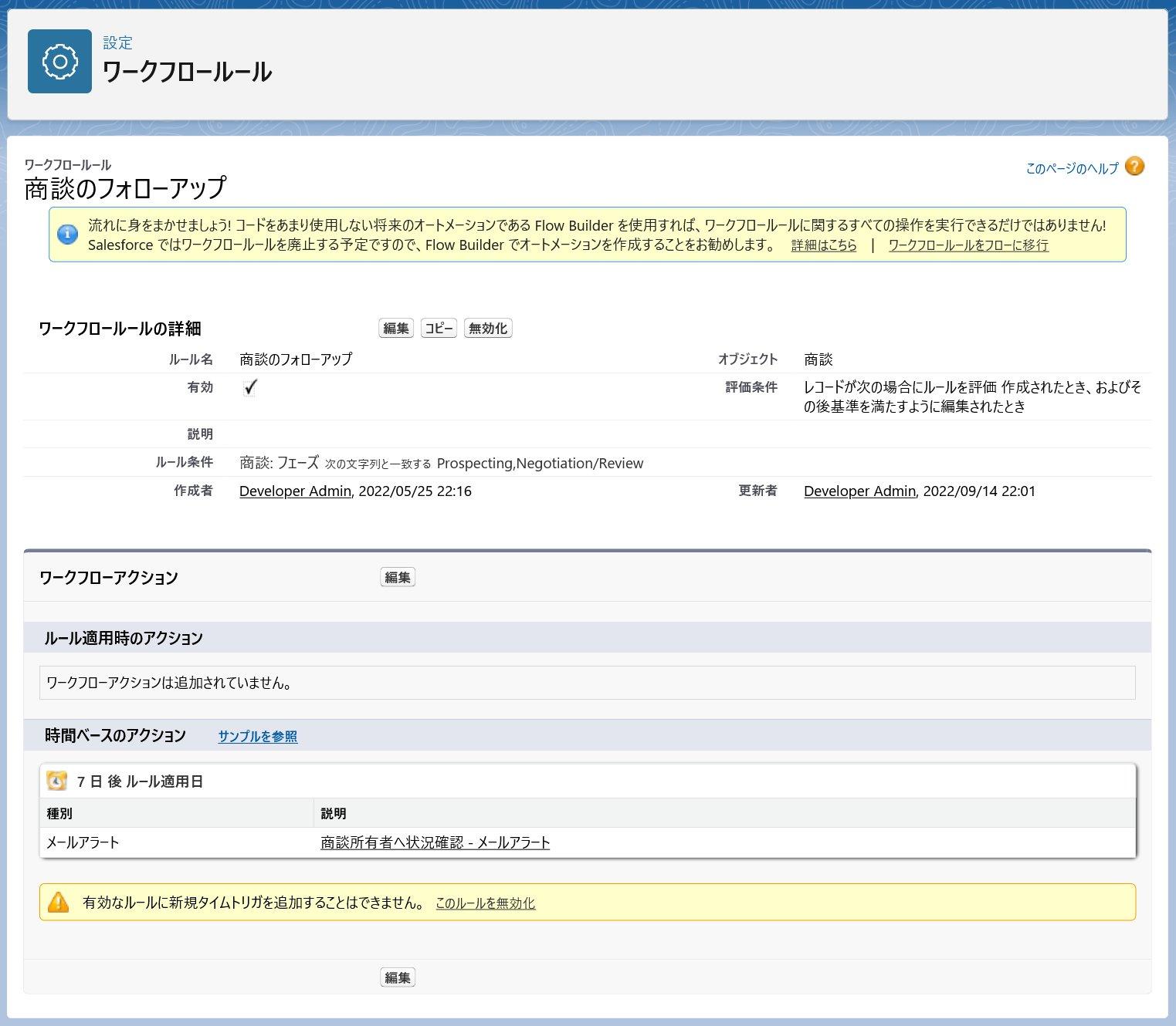 次に、商談の状況を変更してから1週間が経った時にアクション(後述するメールアラート)を実行する設定を行います。
