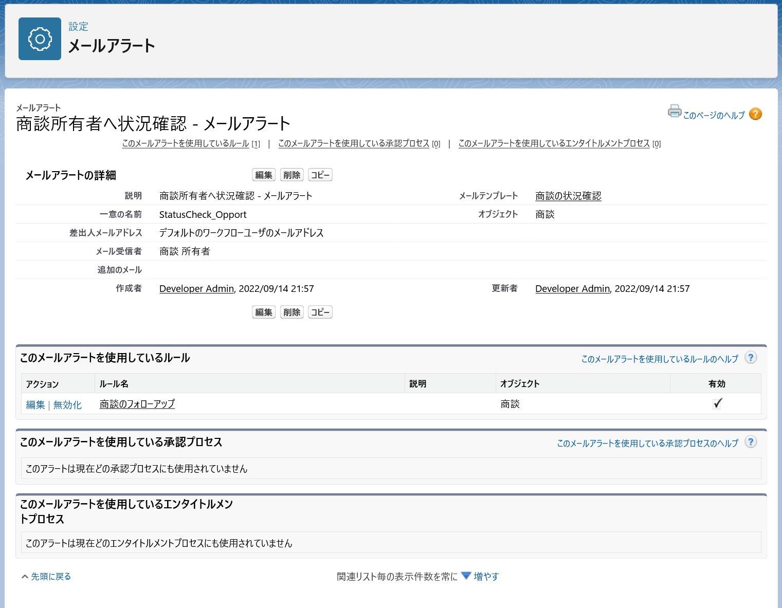 スケジュール済みパスの設定は評価されず、指定したアクションが実行されます。なお、デバックの際、メールアラートのメールは送信されません。メールアラートにて送信されるメールの確認が行いたい場合には、メールテンプレートの設定ページにて「テストの送信と差し込み項目の検証」を使います。