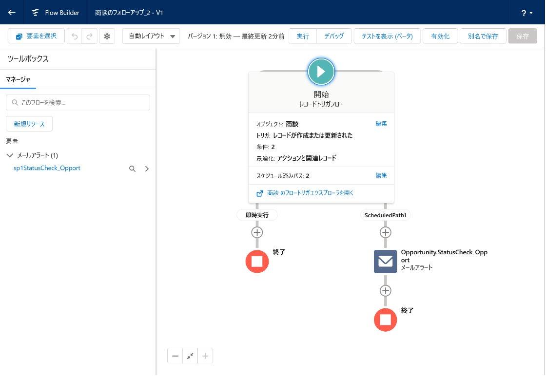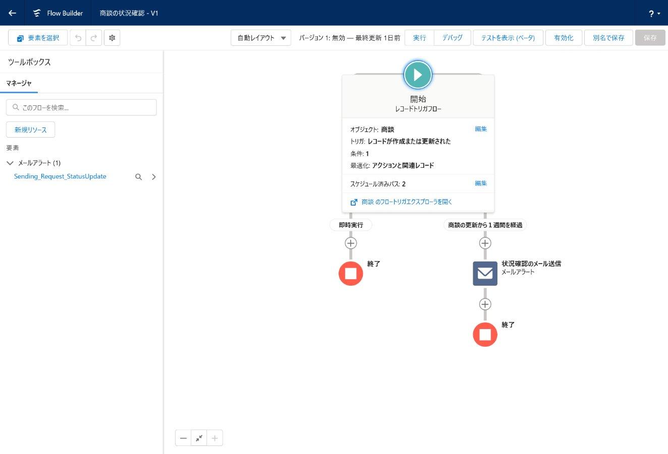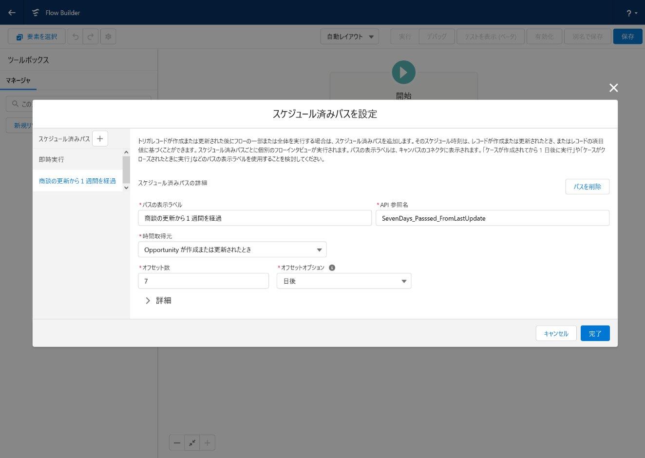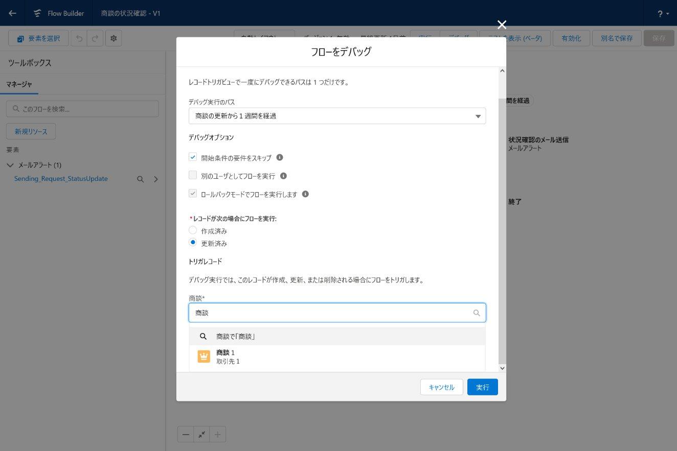 デバッグ実行のパス: 商談更新から1週間を経過 ※上にて設定したスケジュール済みパスを指定します。