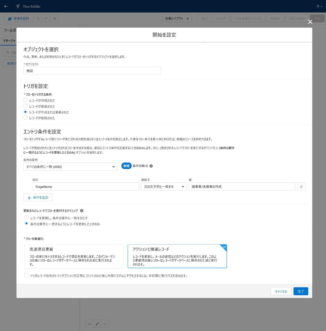 フローの開始条件を指定します。今回は「商談が作成、更新された時に、フェーズに『提案書/見積書の作成』を指定された時」に処理が実行されるように、以下の様に設定します。※挙げられていない項目はデフォルトのままにします。