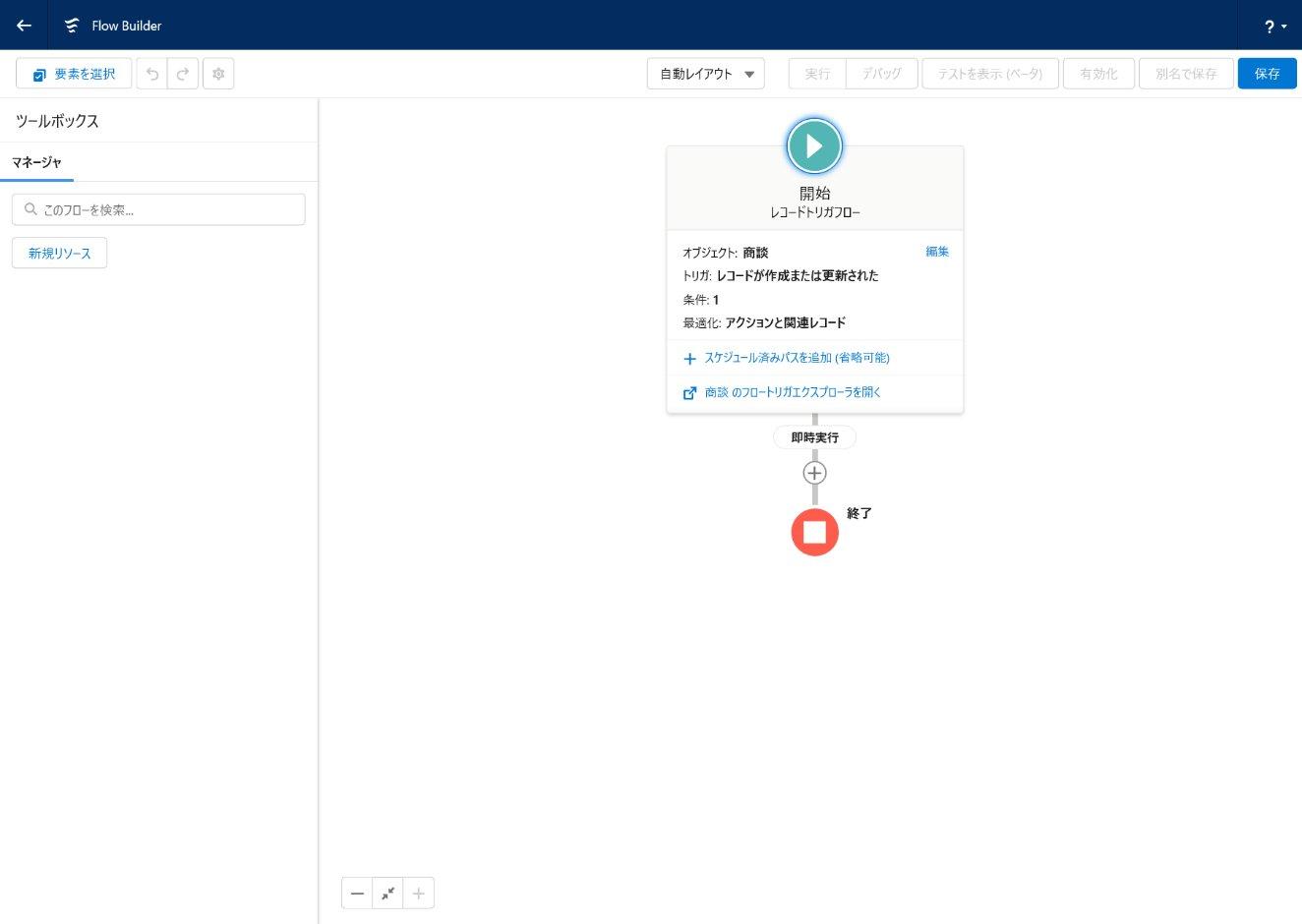 次に、動作の確認をします。確認にはフロービルダーのデバッグ機能を使います。