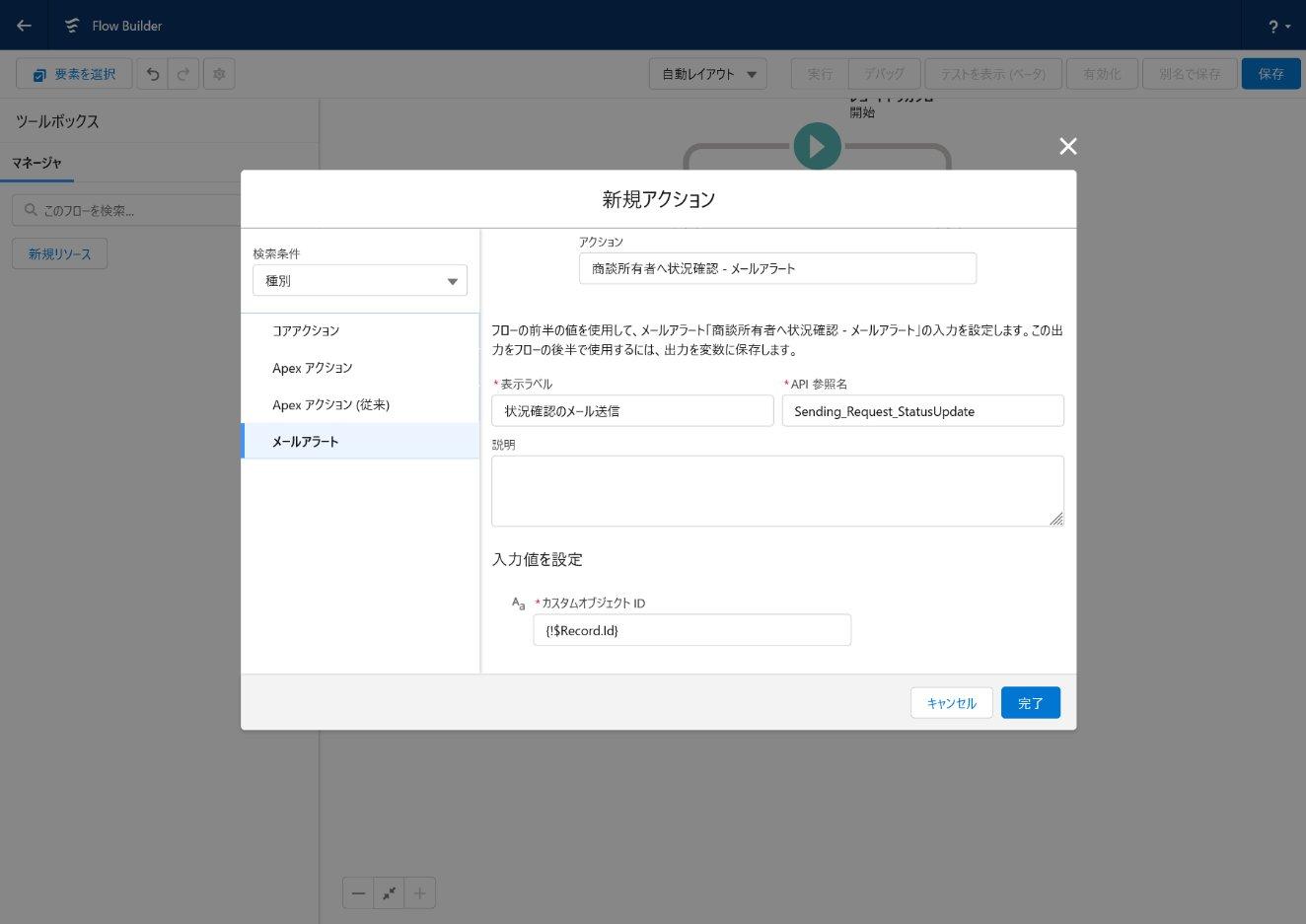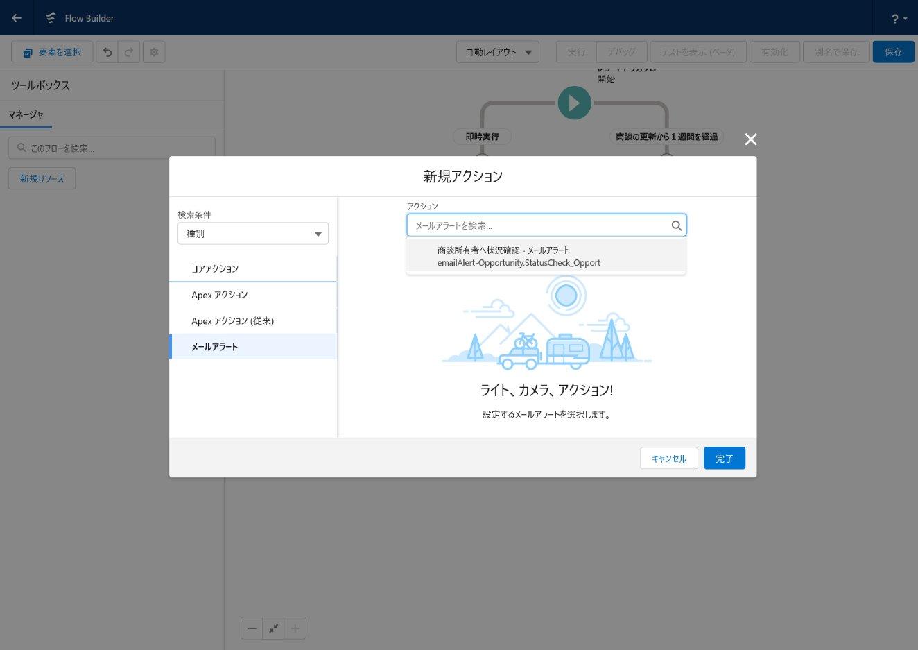 「新規アクション」にて、ポップアップの左側にて「メールアラート」を選び、「アクション」の検索ボックスにてメールアラート名を選びます。※今回の場合、既に作成済みのメールアラートを使います。