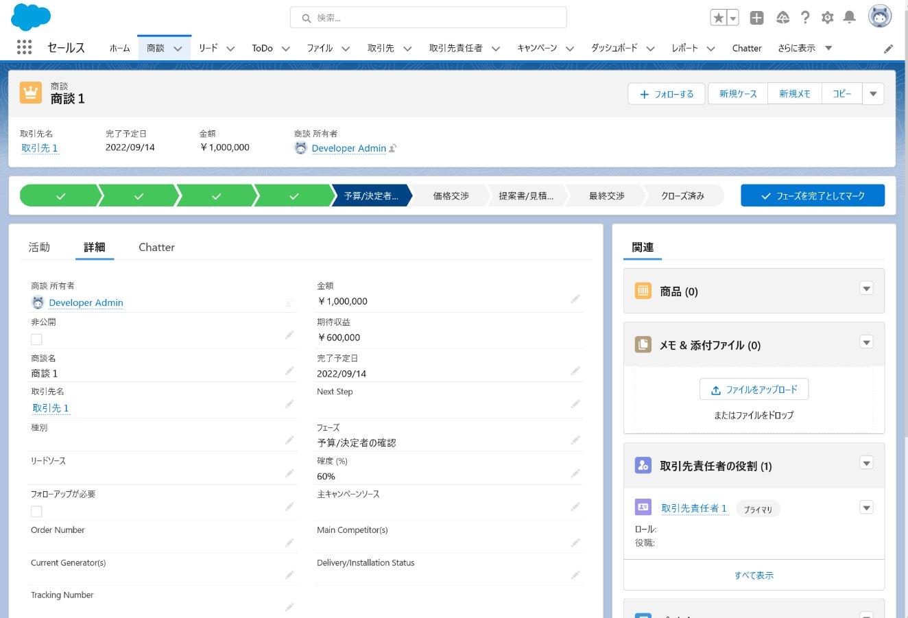 動作の確認に先だって、商談を1件作成します。作成した商談名を控えておきます。