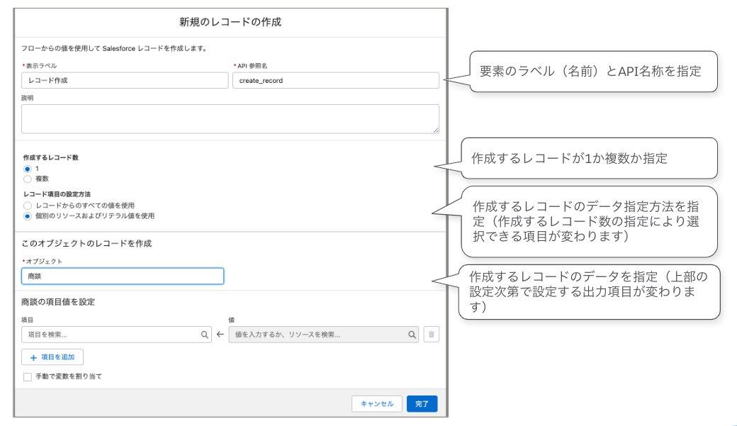 「表示ラベル」にフローのキャンパス上で表示する名称、「API参照名」にこの要素の処理名称を指定します。 - 作成するレコード数