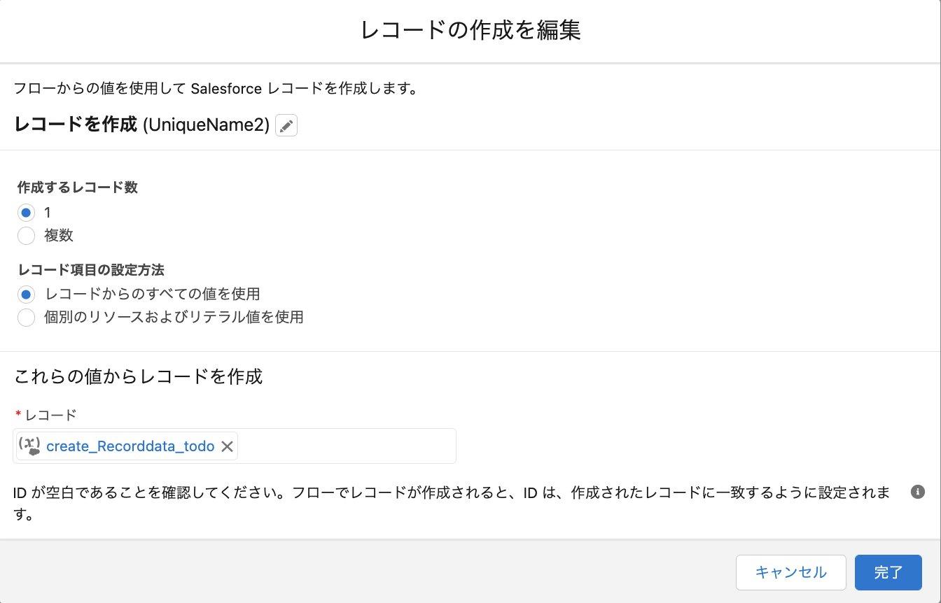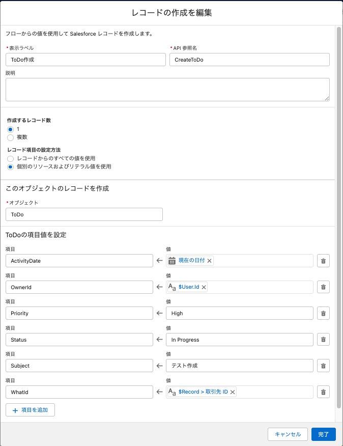 「レコード作成を編集」画面で、作成するToDoの内容を指定し、「完了」を押します。