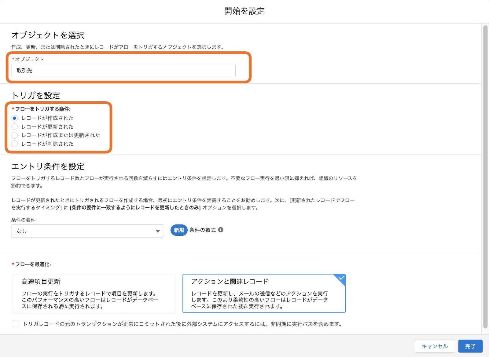 今回は、オブジェクトに「取引先」、フローをトリガする条件に「レコードが作成された」時を指定し、「完了」を押します。