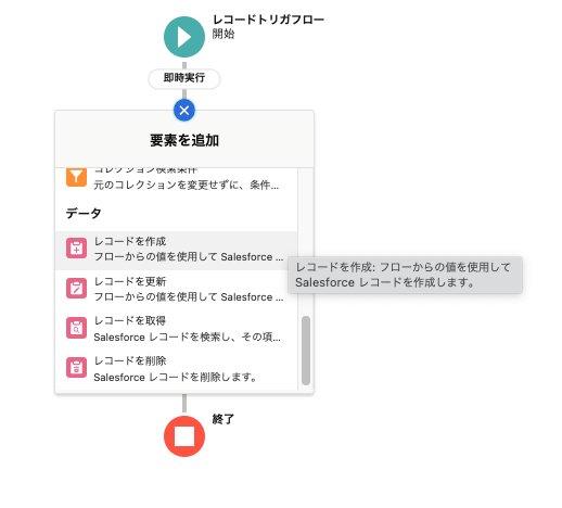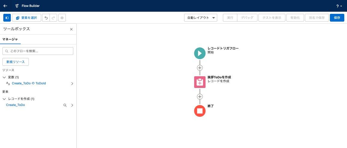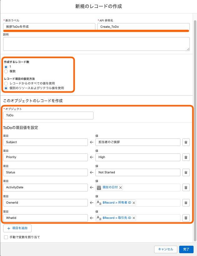 取引先レコードが作成された時に「担当者のご挨拶」のToDoレコードを1件作成するフロー