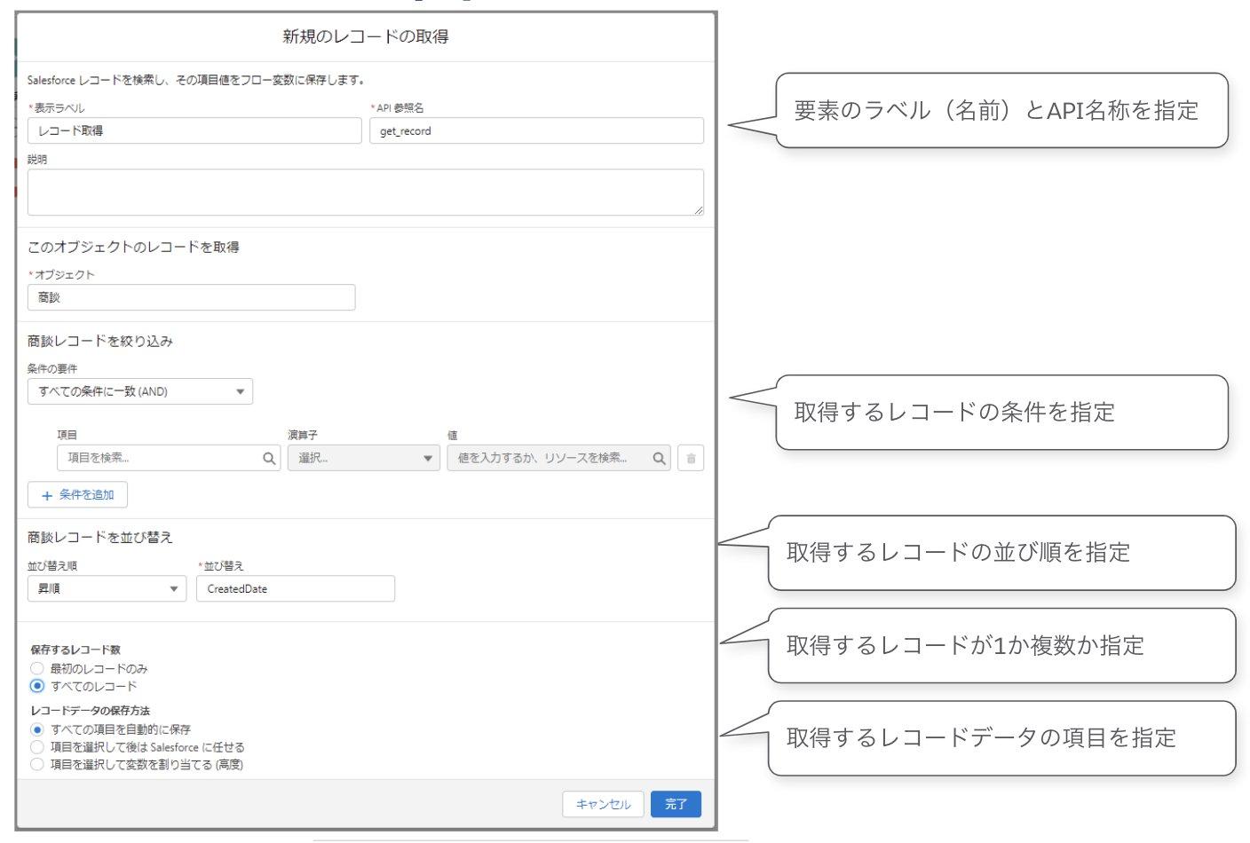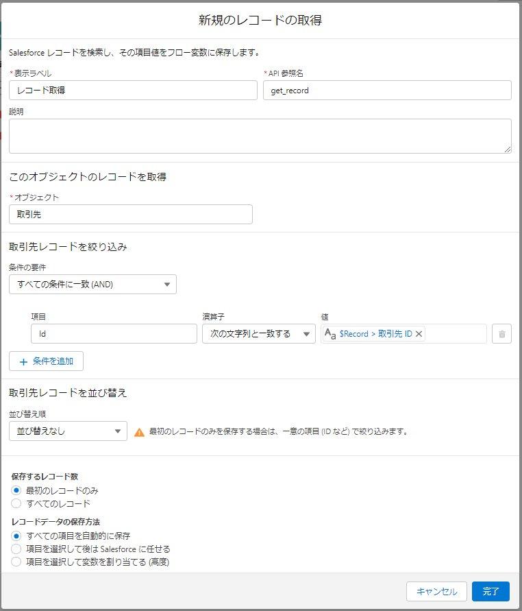 - このオブジェクトのレコードを取得で、取得するレコードのオブジェクトを指定します(この例では取引先)。