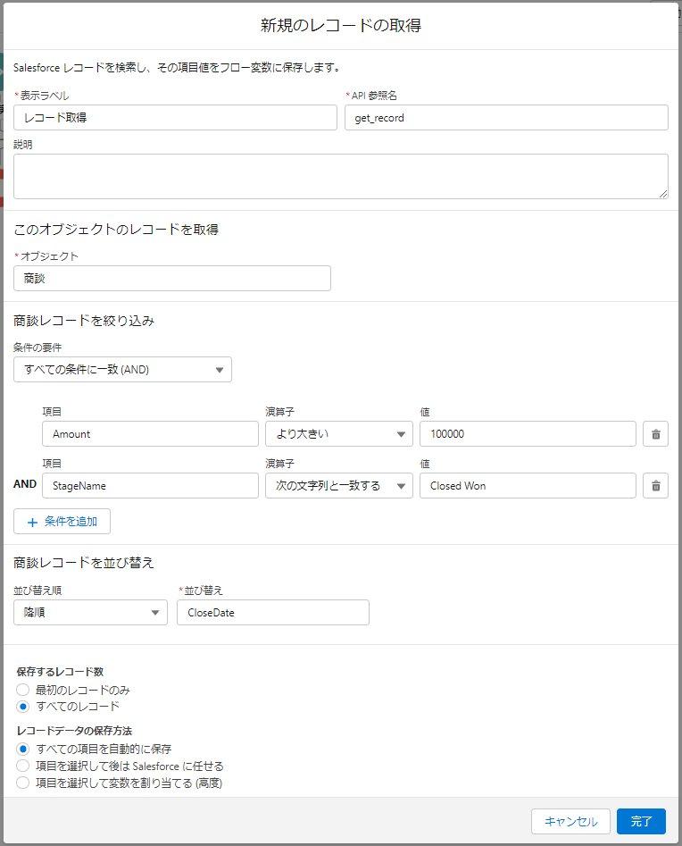 すると、下のエリアに詳細な条件の指定ができるセクションが表示されます。 - (オブジェクト名)レコードを絞り込みで、取得するレコードの条件を指定します。例えば、「金額(Amount)が10万より大きい」かつ「フェーズ(StageName)がClosed Won」といった条件を指定できます。