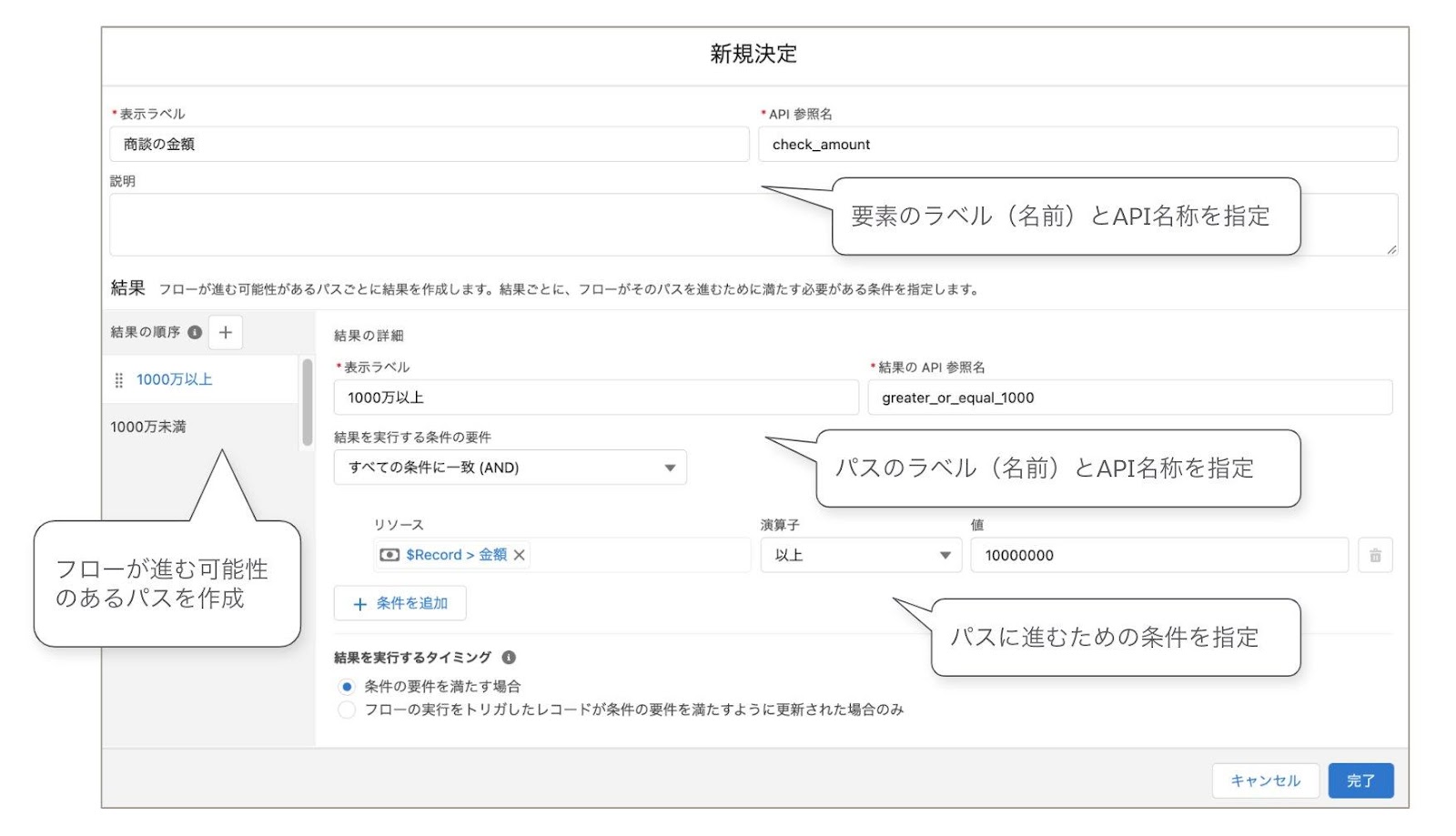 フローが進む可能性のあるパスを作成します。上のパスから順番に条件が評価されます。 - 結果の詳細 - 表示ラベル/API参照名