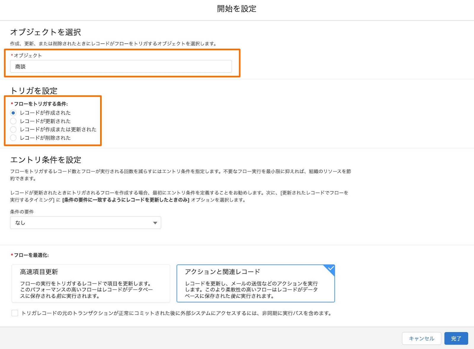 今回は、オブジェクトに「商談」、フローをトリガする条件に「レコードがされた」を指定し、「完了」を押します。