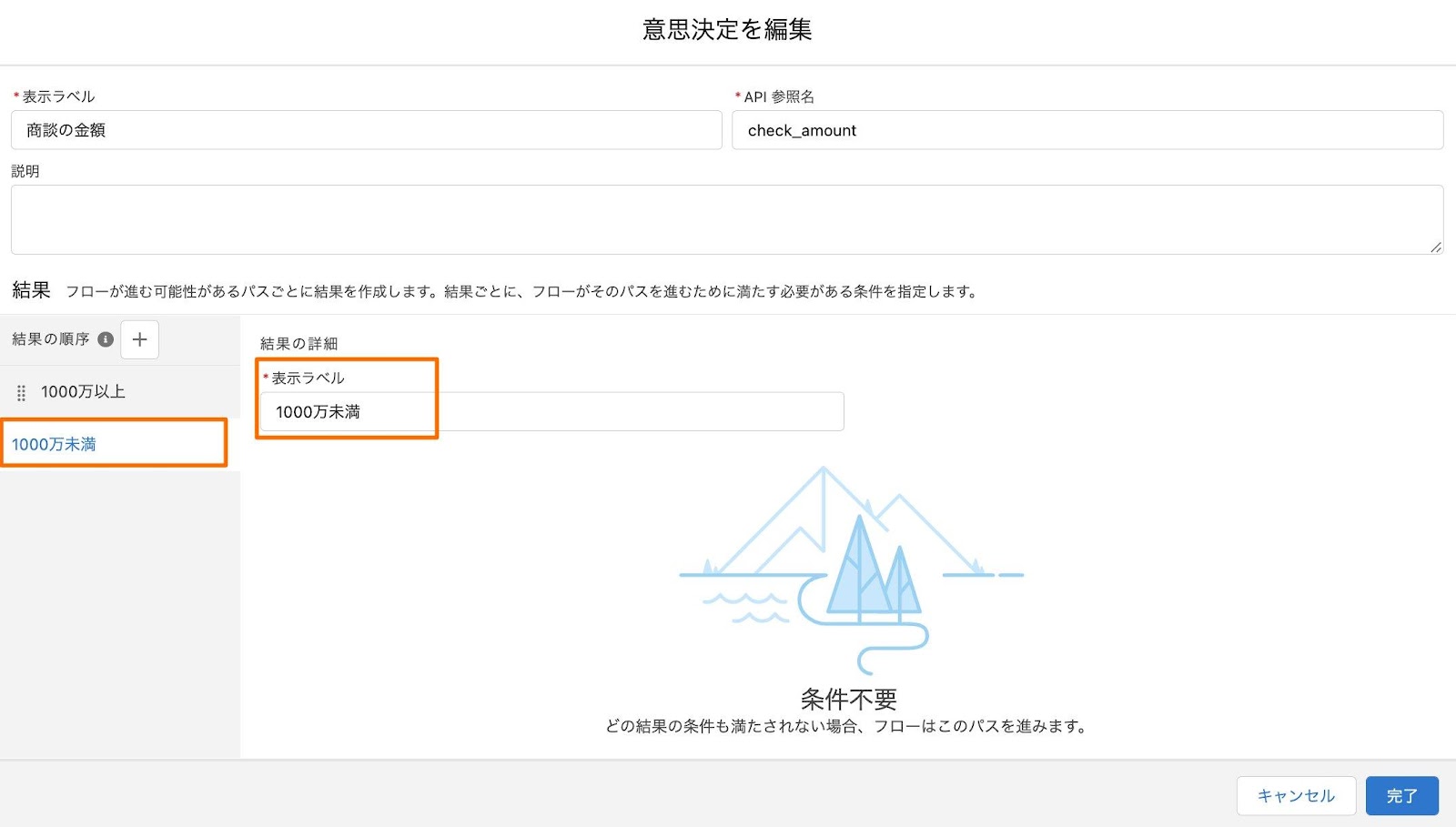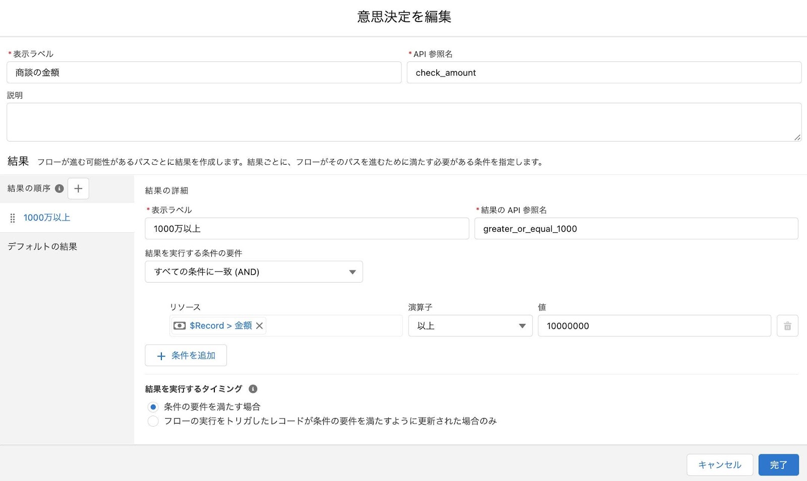 - 表示ラベル、API参照名を指定します。(今回の例では商談の金額が1000万以上か否かを条件としています)