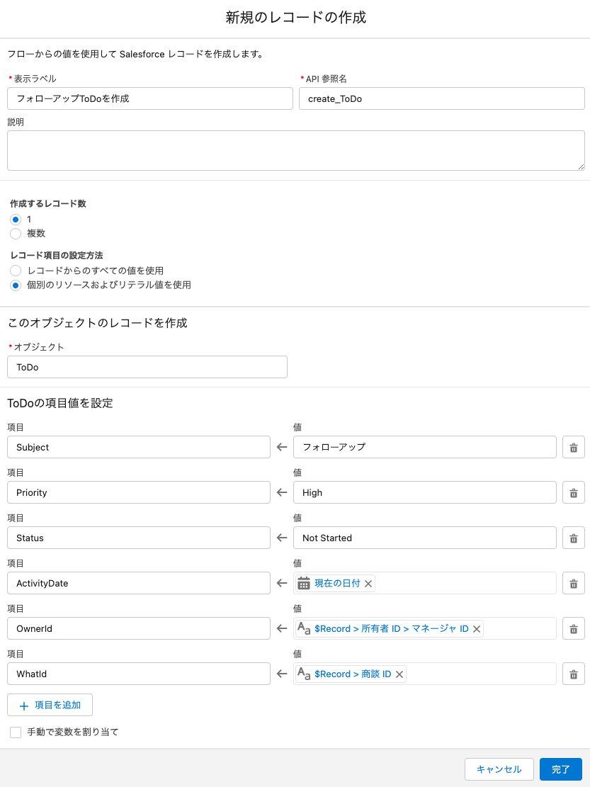 「レコード作成を編集」画面で、作成するToDoの内容を指定し、「完了」を押します。