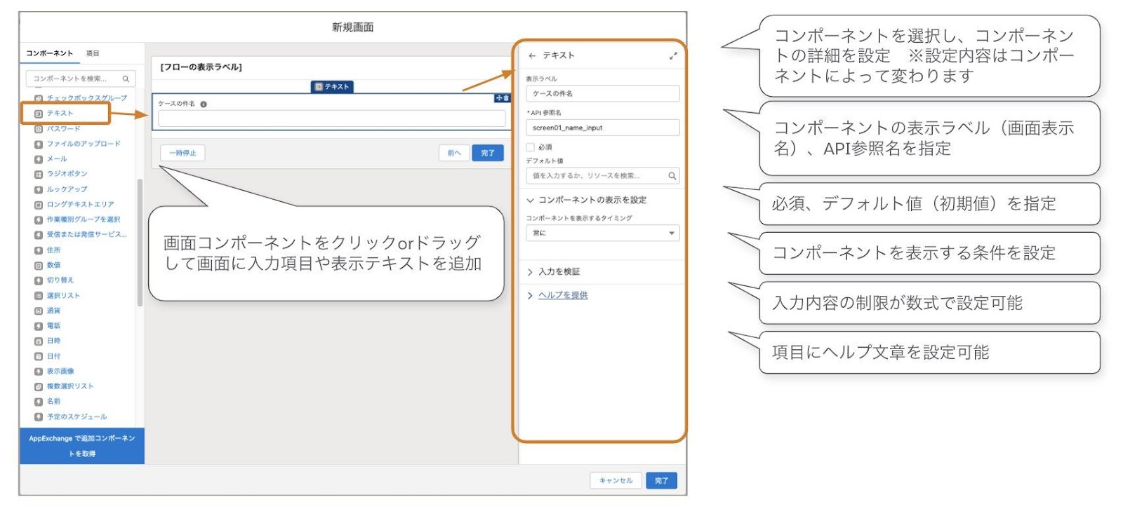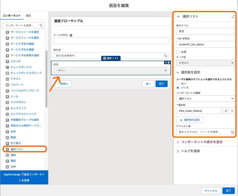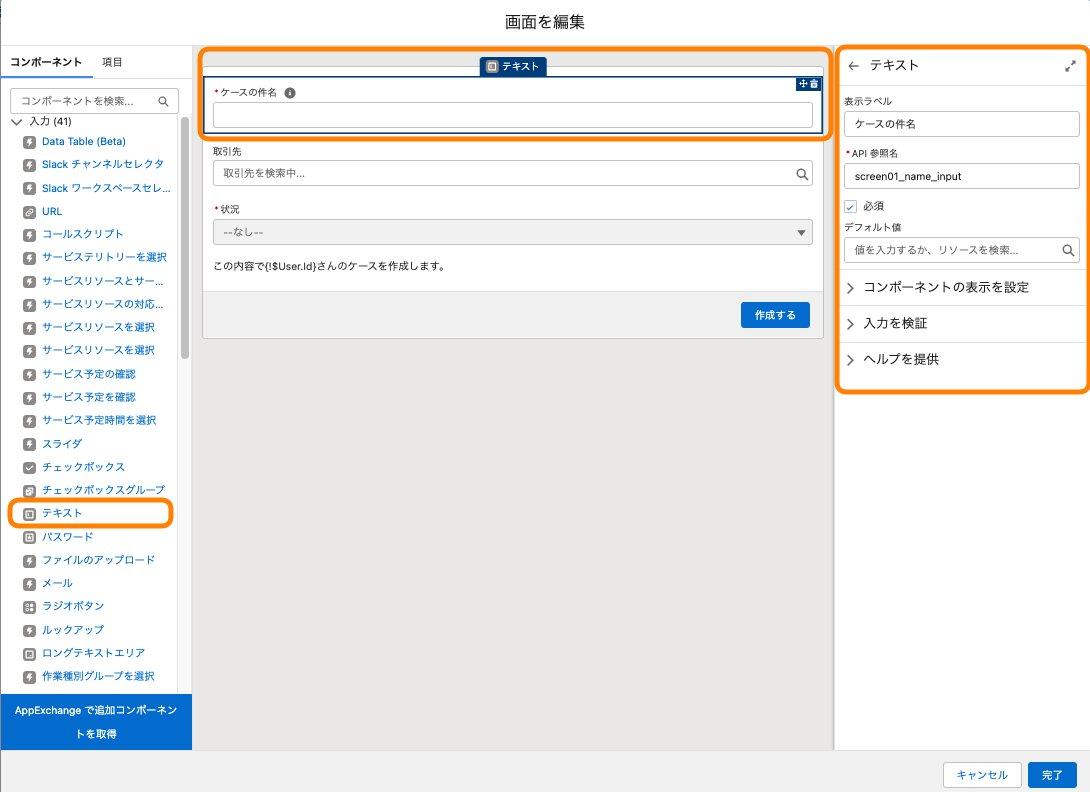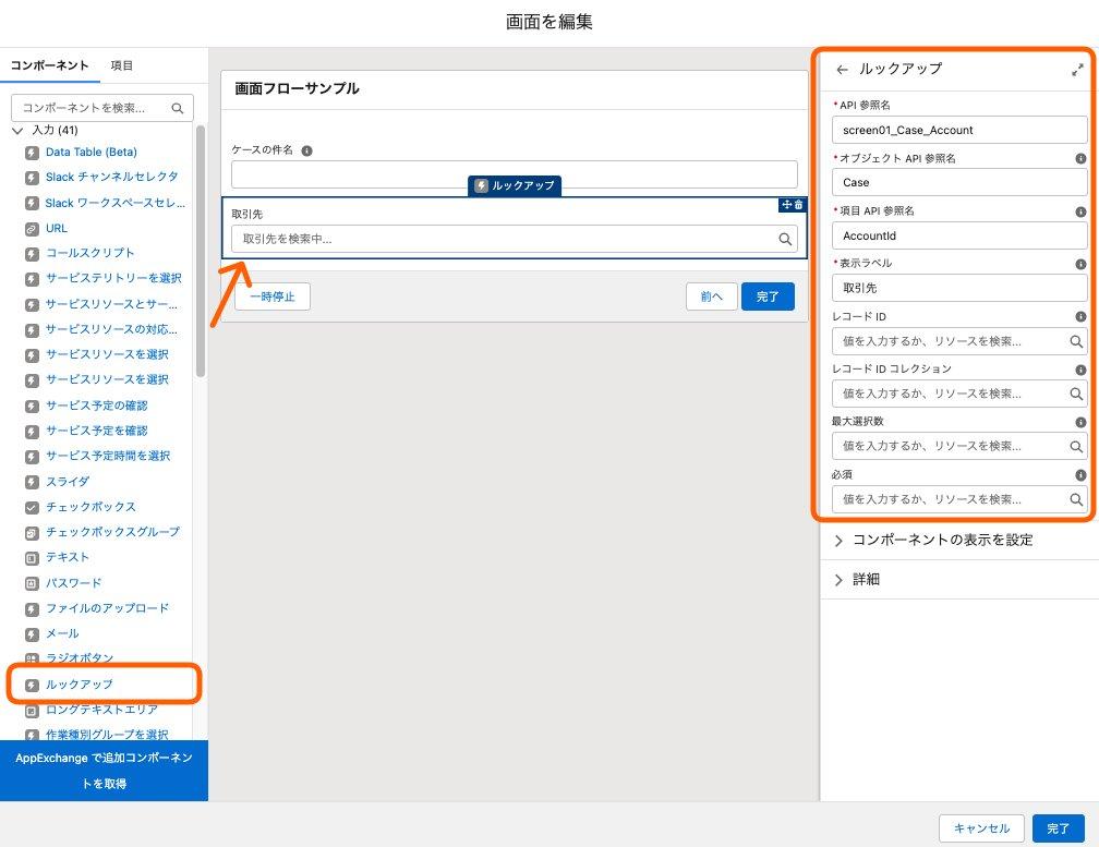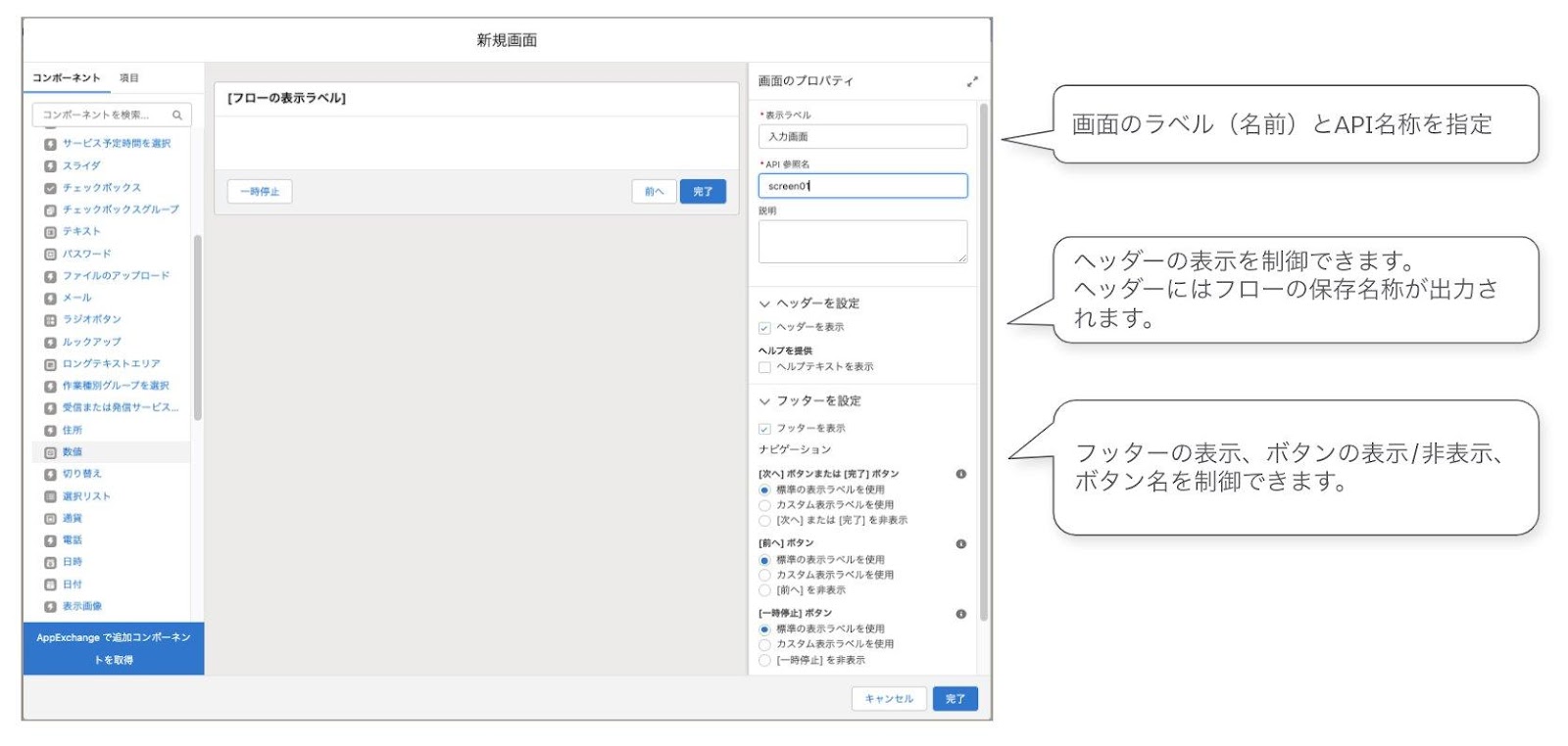 ※各種画面コンポーネントの設定はこちらの「提供されるフロー画面コンポーネント」Helpを参照ください