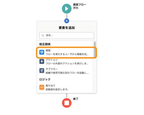 「画面フロー」の下の「+」から画面を選択します。