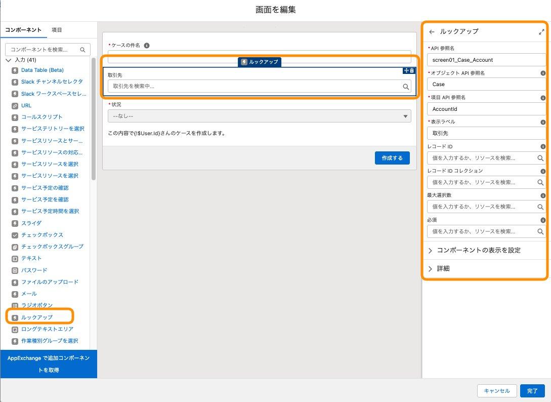 ルックアップコンポーネントを選択し、画面に配置し以下を設定- API参照名:screen01_Case_Account