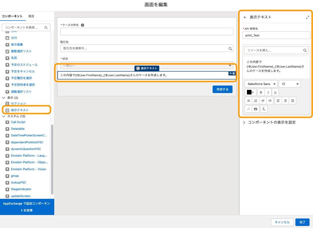 - テキストの内容:ここの内容で{!$User.FirstName}_{!$User.LastName}さんのケースを作成します。