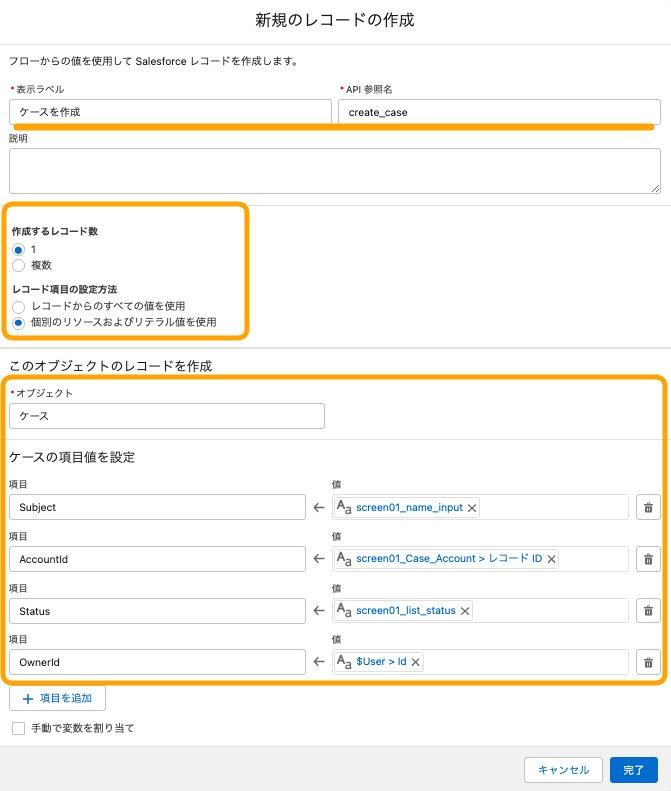 - 取引先(AccountId) :{!screen01_Case_Account.recordId} ※screen01_Case_AccountのレコードIDを指定