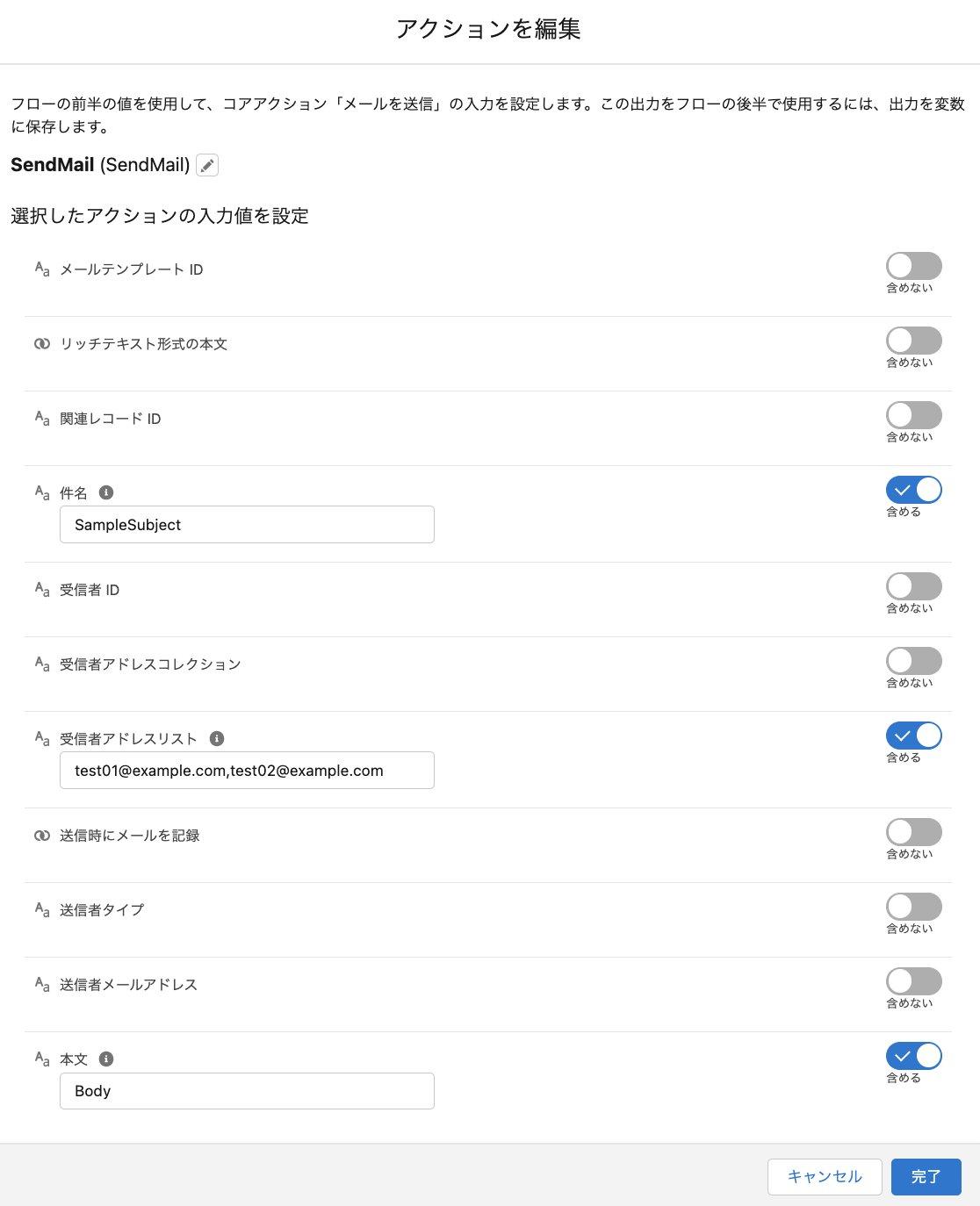 続けて、フローの[メールを送信]要素にて下記設定します。