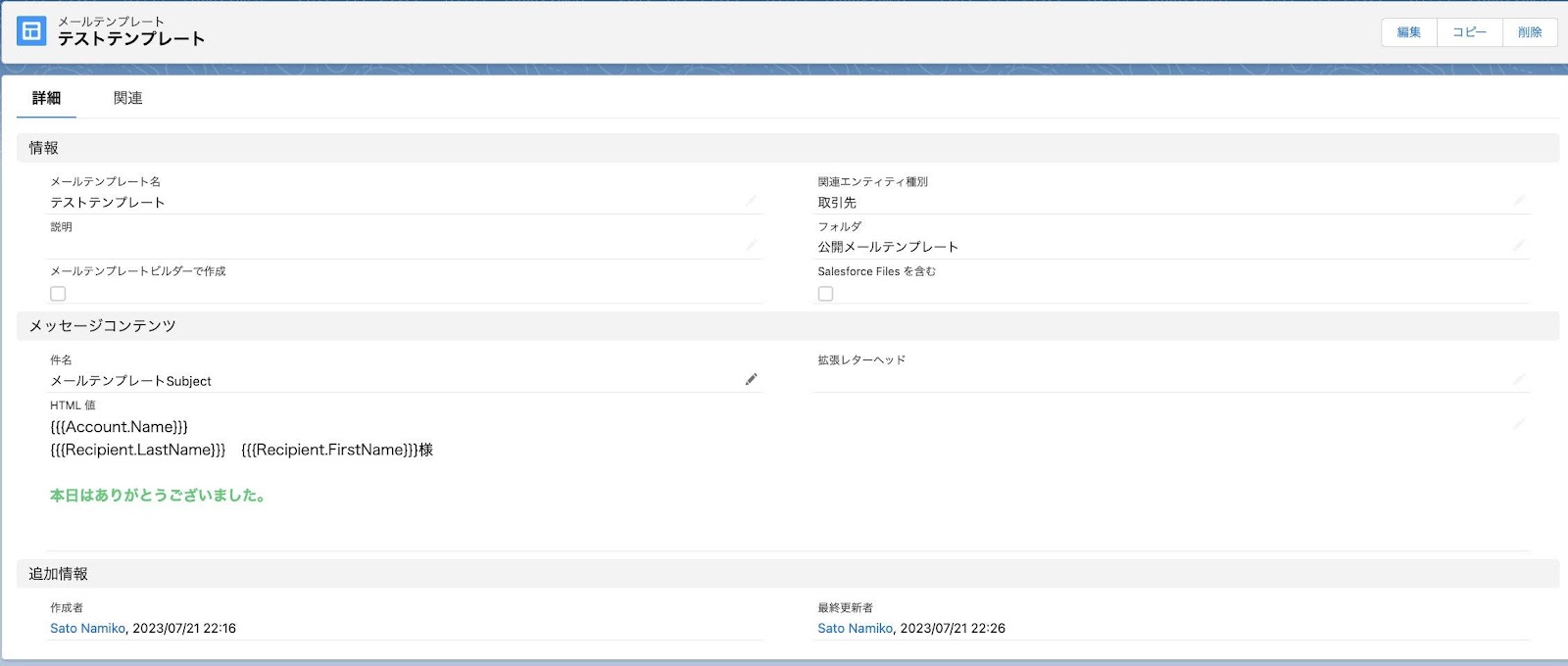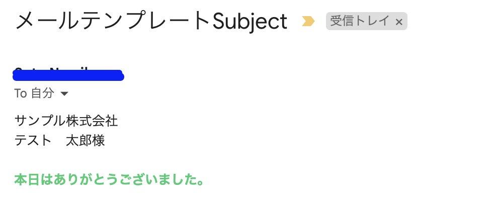 今回は本文に取引先責任者の[姓]と[名]、[取引先名]を差し込み項目で入れています。