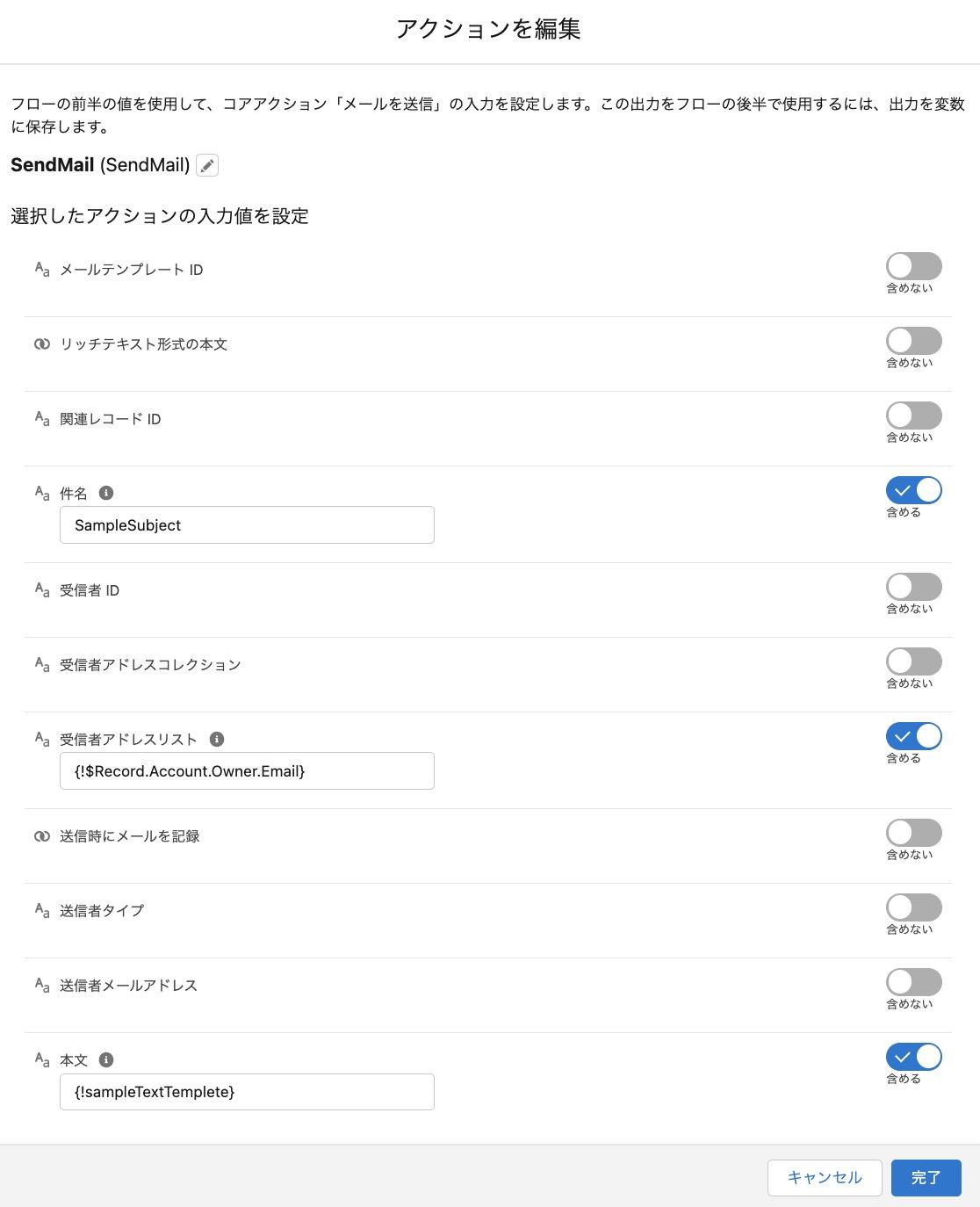 - 受信者アドレス(カンマ区切り): トリガレコード(更新した商談)の親取引先レコード所有者のメール項目を指定