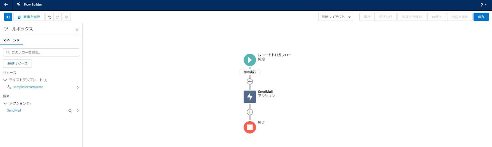 「デバッグ」から、テスト実行するレコードを選択し、処理がエラーなく実行されるか確認を行います。