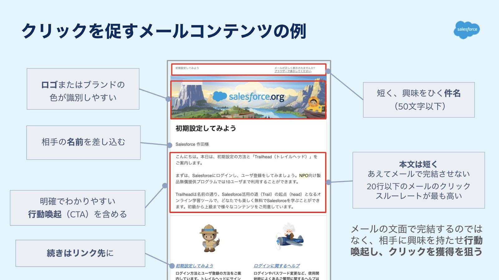 メール内の本文で伝えたいすべての情報を網羅する必要はありません。あくまで動機づけを行い、リンククリックをした先のウェブページで情報をお伝えしていく構成を心掛けることが重要です。