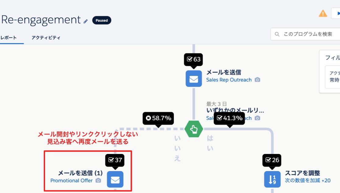 また、シナリオ自体に工夫を入れることもできます。例えば、メール開封やリンククリックしない見込み客へ日にちを少し開けて再度メールを送ることも有効です。