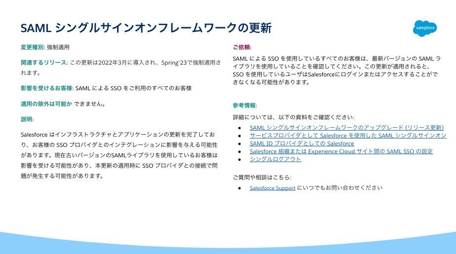 こちらは以前にもご紹介いたしましたが、このリリース更新が自動適用されると、 SAMLによるシングルサインオンの動作に影響を与える可能性がございますため、Sandboxでリリース更新を有効にしていただき、動作の事前確認をお願い致します。