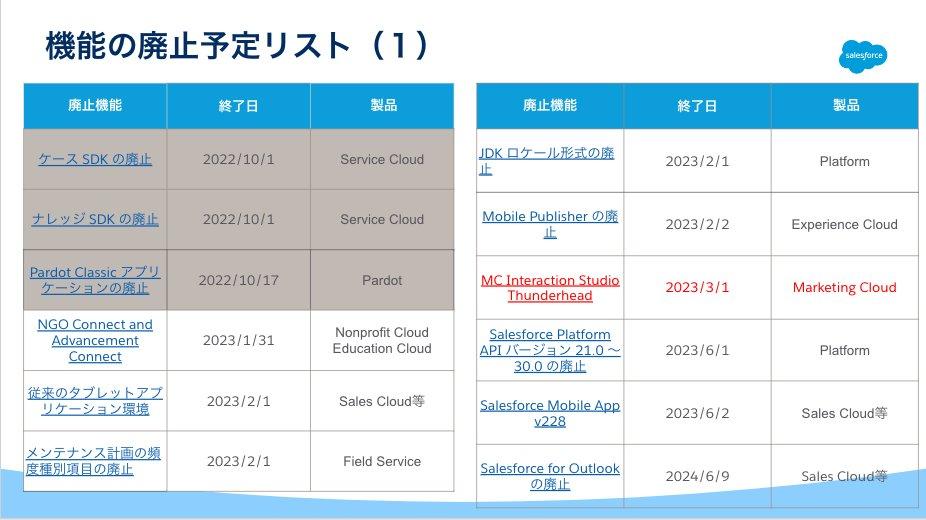 まずは、Marketing Cloudに関するもので、Thunderhead が組み込まれた従来版の Interaction Studio 製品の廃止です。こちらは2023 年 3 月 1 日に廃止が予定されています。