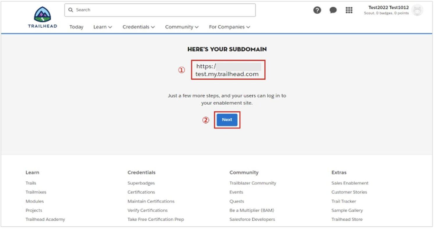 - サブドメインの取得を行うには、予めご自身のSalesforceアカウントにすべてのシステム権限を付与したSales Enablementの管理者向けの権限セットが割り当てられている必要があります。