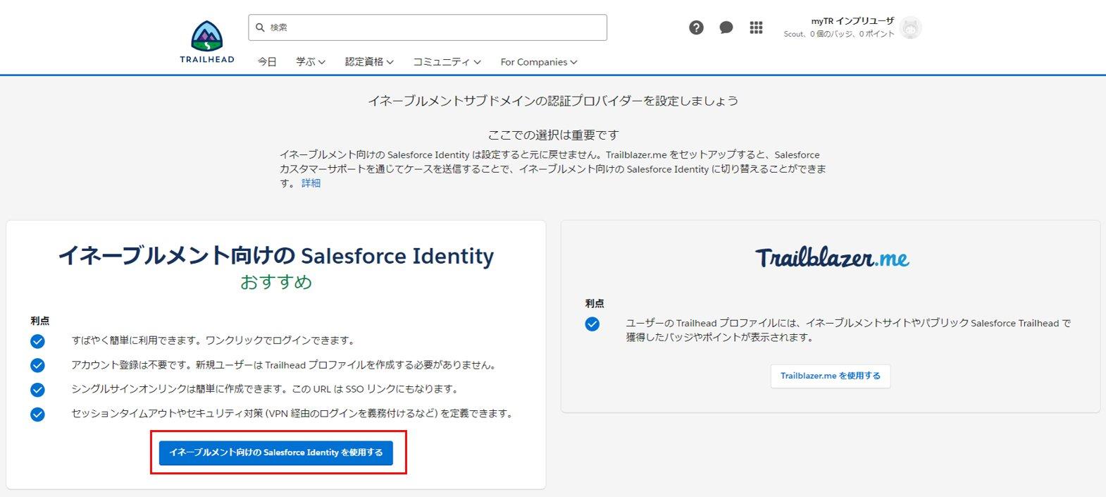 仕組みの詳細は Salesforce Identity for myTrailhead の選択に関する考慮事項をご確認ください