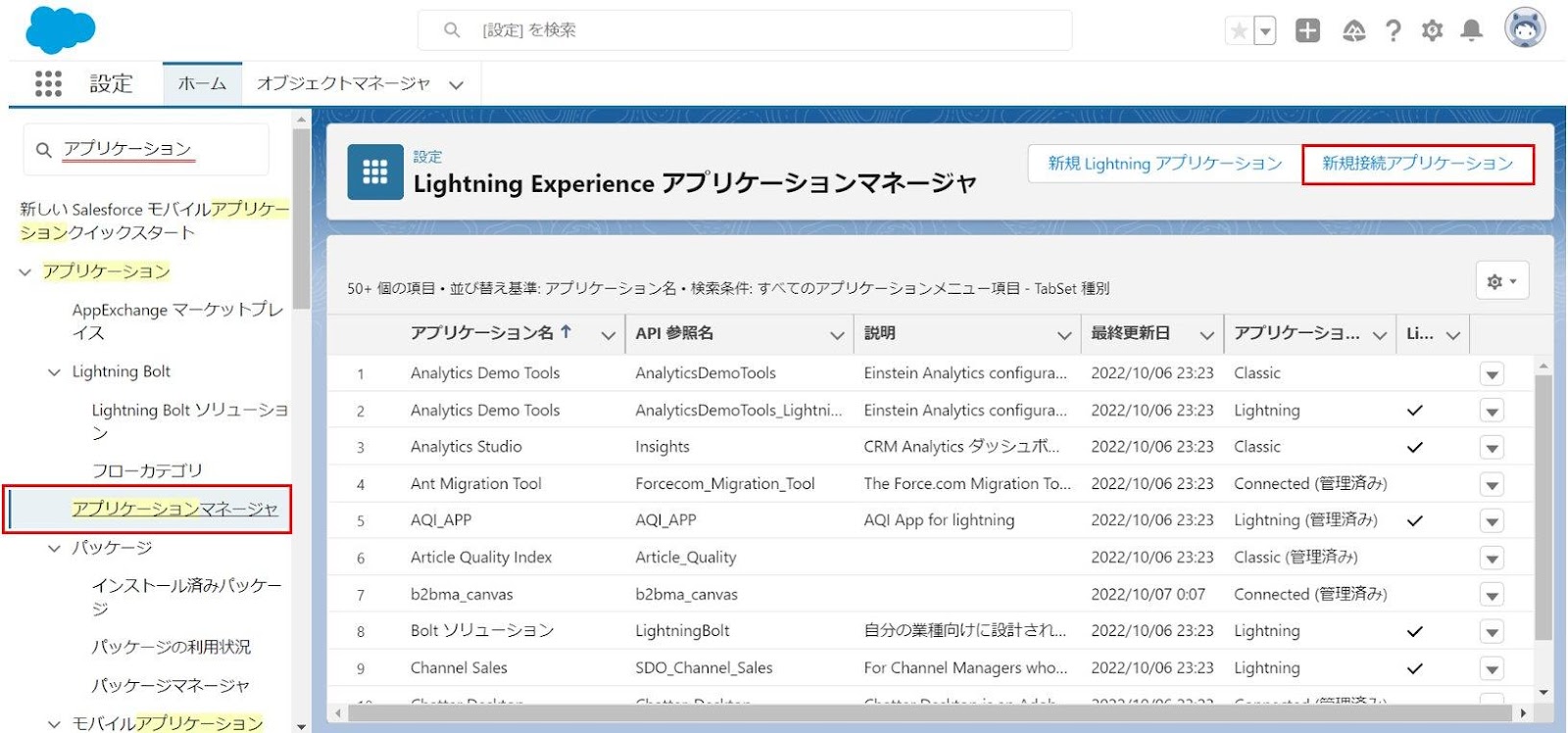 Salesforce組織にログインし、画面左上のクイック検索ボックスより「アプリケーションマネージャ」メニューを検索します。