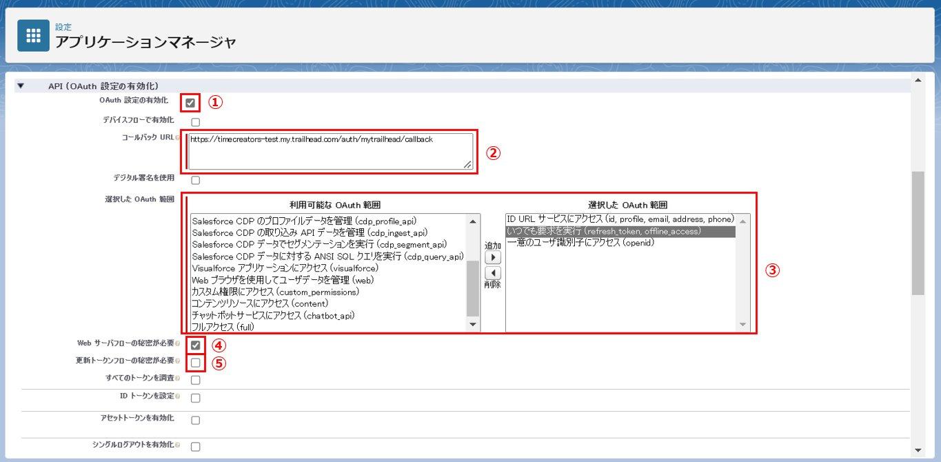 ※誤ったURLを設定してしまうと、ユーザがSales Enablementにログインできなくなりますのでご注意ください。 - OAuth範囲に以下3つのアクセス権限を選択します。