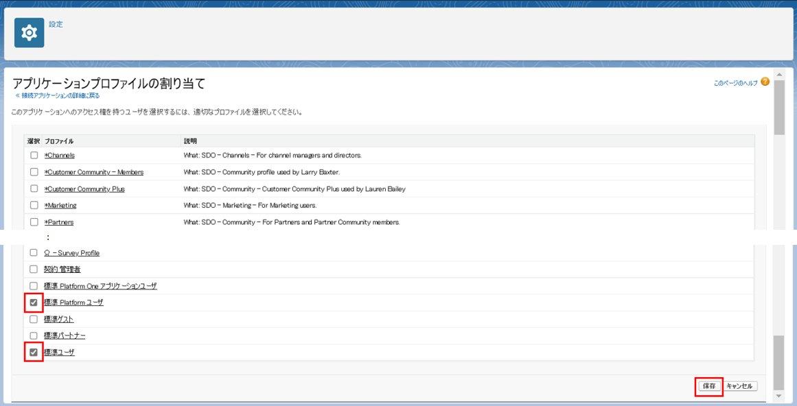 下図の割り当ては一例ですが、割り当てを行うales Enablement利用者のプロファイルにチェックをつけ、「保存」します。