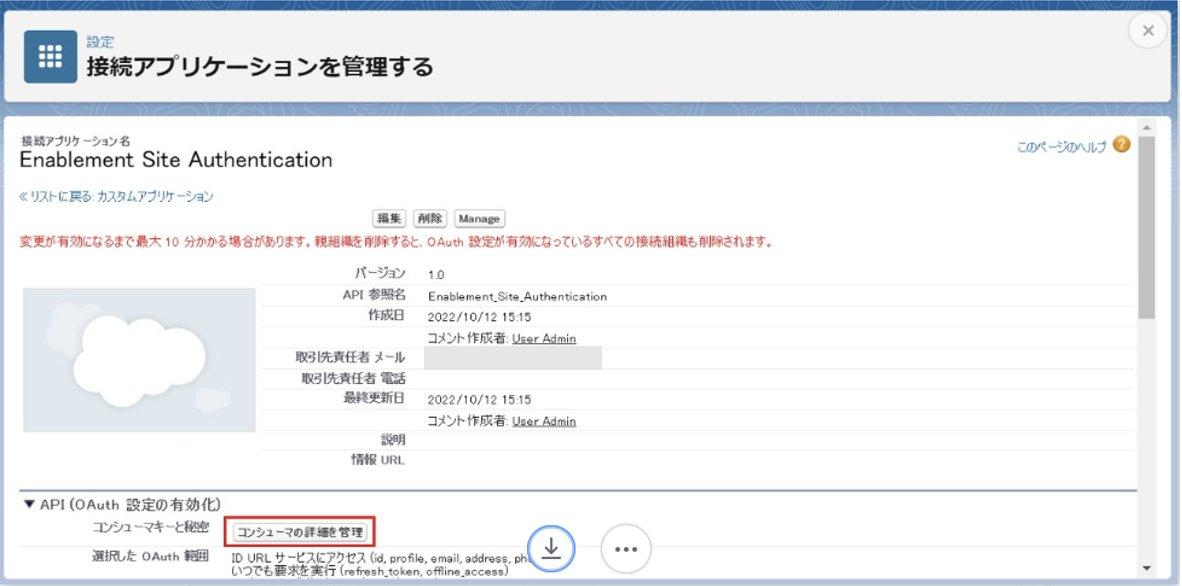 「API(OAuth設定の有効化)」セクションより、「コンシューマの詳細を管理」ボタンをクリックします。