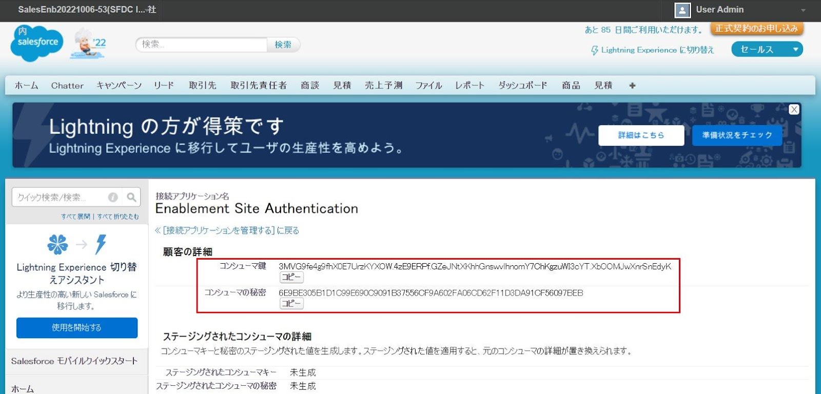 サブドメインの取得後以下画面が表示されますが、先にSalesforce組織にて接続アプリケーションを作成します。後の手順で本画面は使用するので、ウィンドウを閉じずにそのままにしておきます。