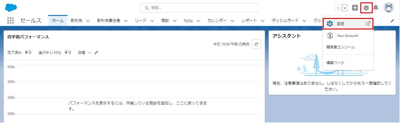 Sales Enablementの設定に必要な権限セットを作成します。画面右上のギアアイコンをクリックし「設定」を選択します。
