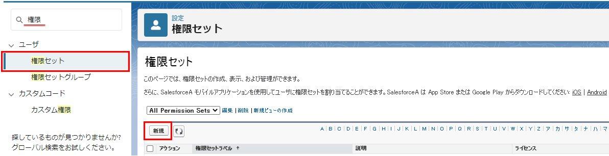 検索結果から、「ユーザ」>「権限セット」を選択します。「新規」ボタンから権限セットを作成します。