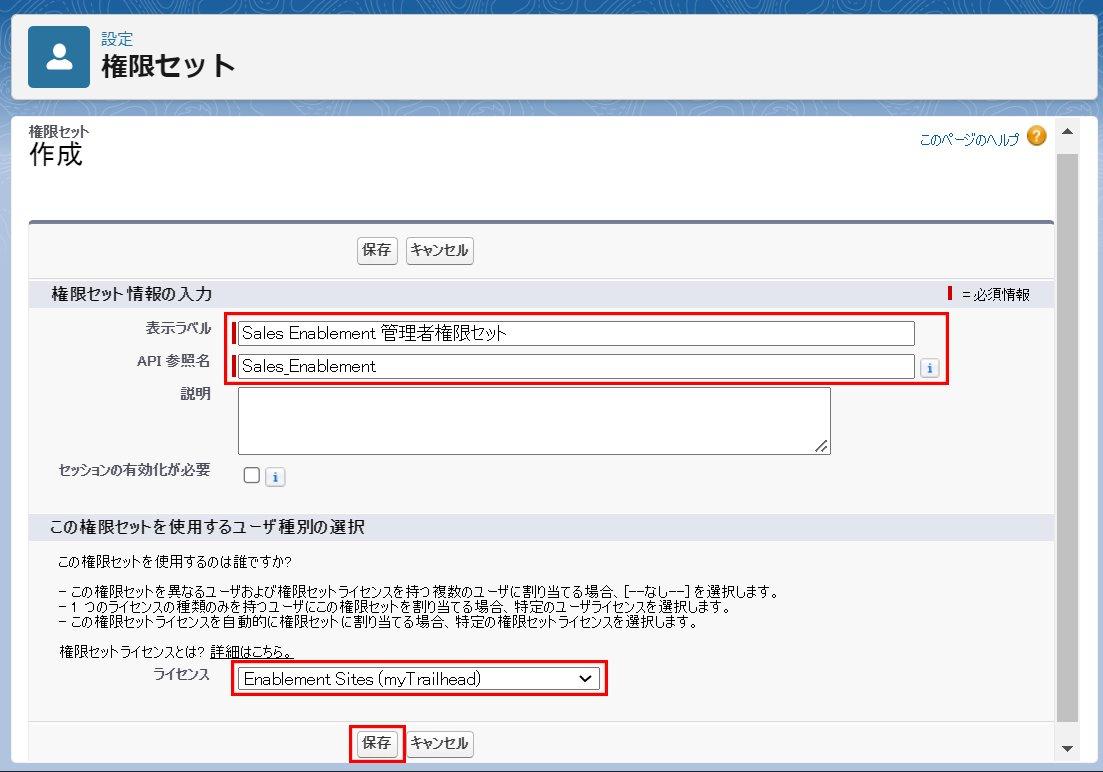 権限セットの情報を入力し、Sales Enablementの権限セットに使用するライセンスを設定します。