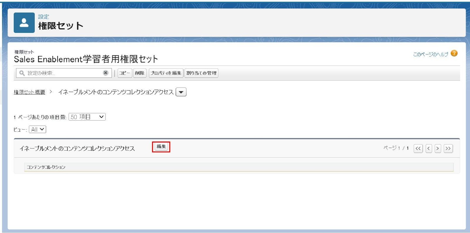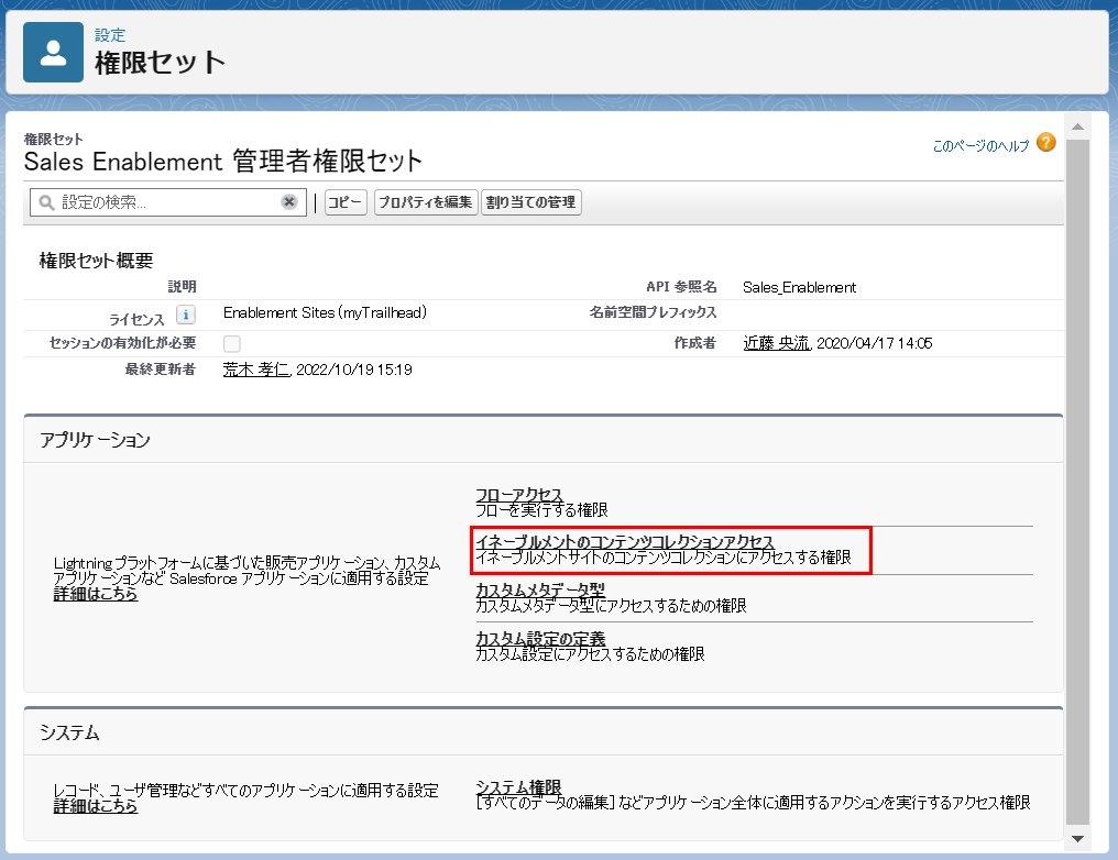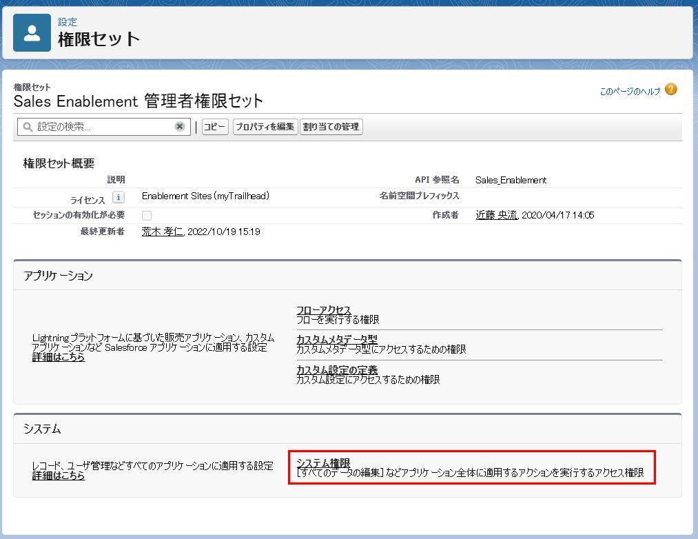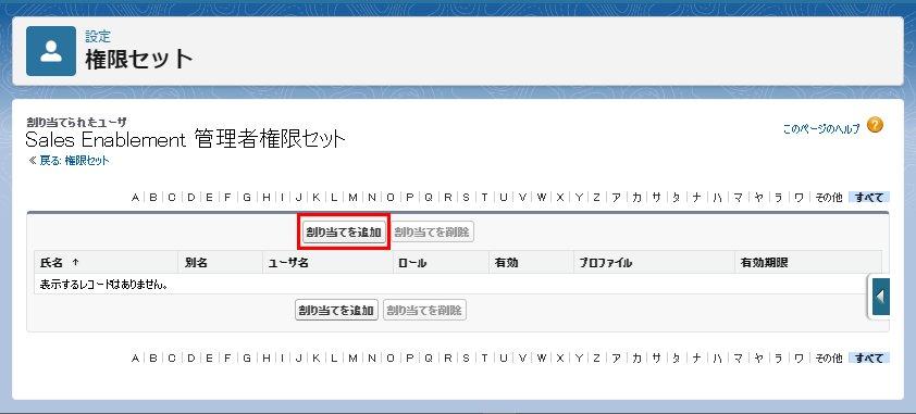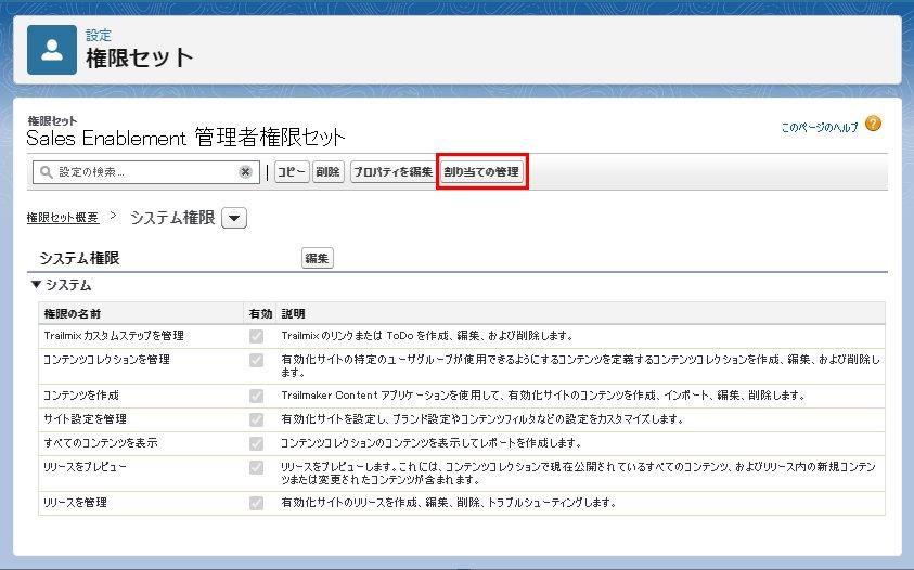 これでユーザへの権限セットの割り当ては完了です。上記スクリーンショットでは「Sales Enablement 管理者権限セット」を割り当てましたが、その他の役割のユーザの権限セットも同様に各役割のユーザへの割り当てが必要です。