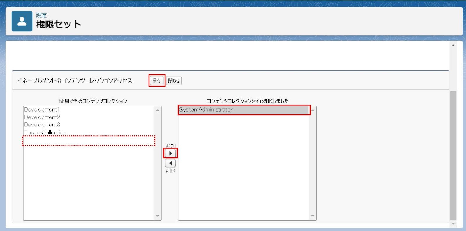 「使用できるコンテンツコレクション」から任意のコンテンツコレクションを選択し、「追加」>「保存」を選択します。