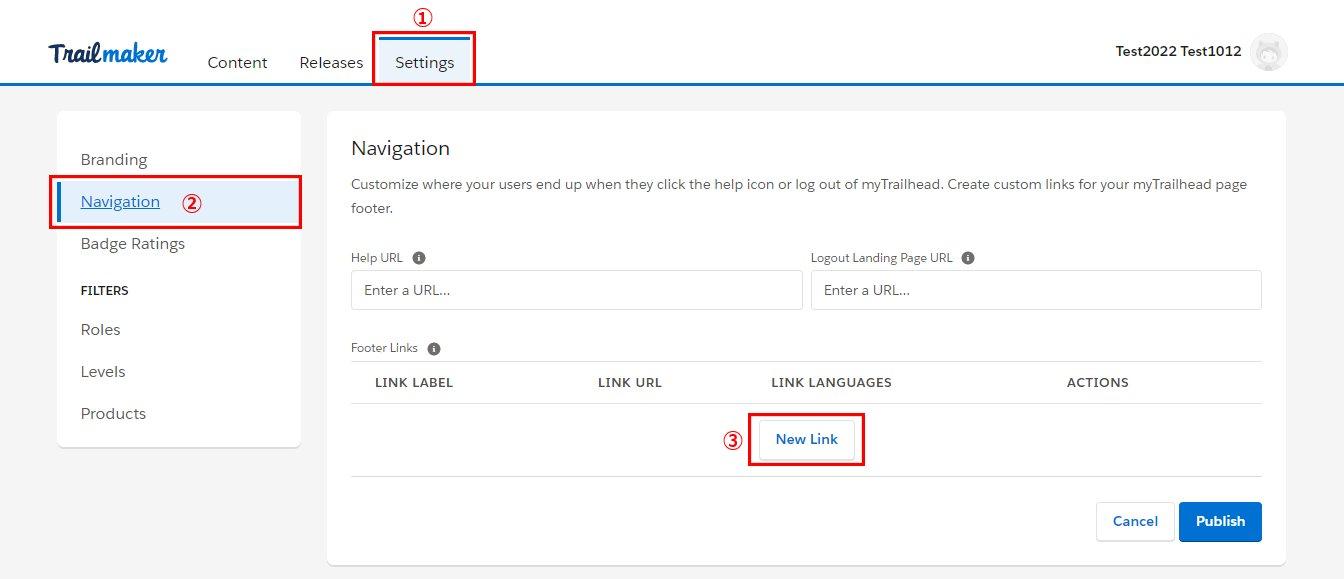 以下設定を行うことで独自のヘルプサイトにユーザを誘導することができます。設定方法は、Trailmakerの「Settings」タブの「Navigation」ページからHelp URLに任意のWebアドレスを入力し、「Publish」ボタンをクリックします。