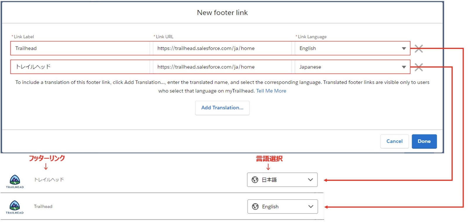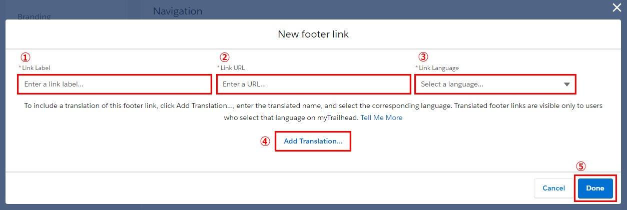- 別の言語選択時のリンク設定を追加する場合は、「Add Translation...」をクリックし1~3のステップを繰り返します。