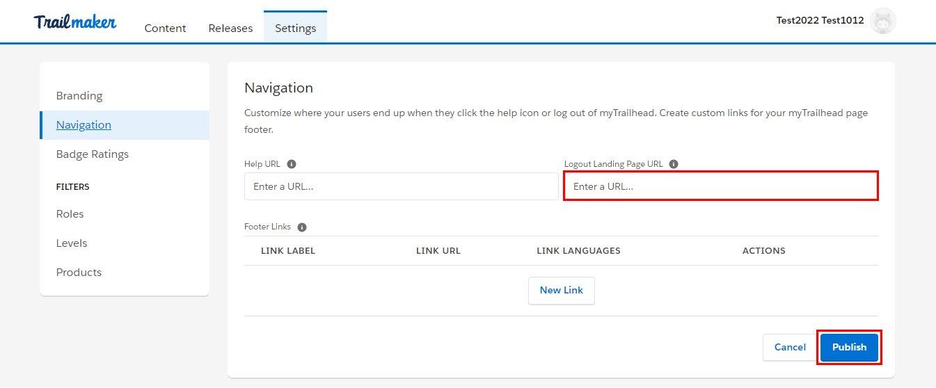 設定方法は、Trailmakerの「Settings」タブの「Navigation」ページからLogout Landing Page URLに任意のWebアドレスを入力し、「Publish」ボタンをクリックします。