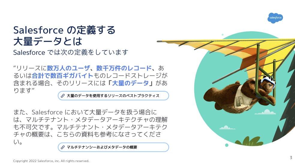 大量データを扱う場合には、どのようなアーキテクチャにすべきか、どのような機能を利用すべきか、より深い知識が必要になります。Salesforceは多くの場合、優れたパフォーマンスで処理を実行できますが、大量データで適切な考慮をしないと問題が発生する場合があります。