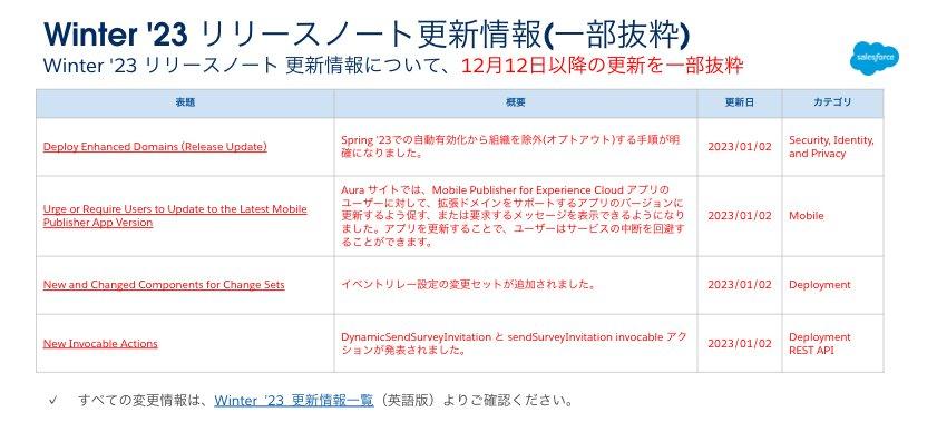 続いて、Winter’23リリースノートの更新情報です。12月12日以降の更新内容の中から、管理者様に把握しておいていただきたい内容をピックアップしてます。ここでは、特に重要な拡張ドメイン関連の情報を記載します。
