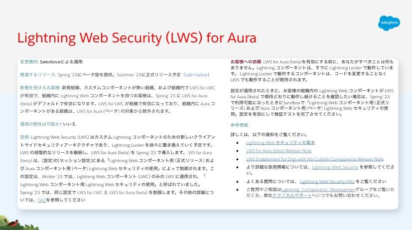 お客様の組織内の Lightning Web コンポーネントが LWS for Aura (Beta) で期待どおりに動作し続けることを確認したい場合は、Spring '23 のSandboxで「Lightning Web コンポーネント用 (正式リリース) および Aura コンポーネント用 (ベータ) Lightning Web セキュリティの使用」設定を有効にして検証をお願いいたします。