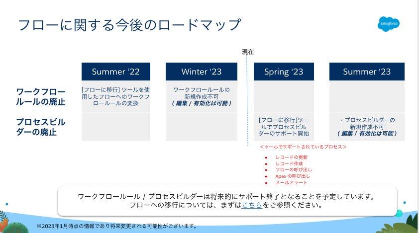 こちらは、フローに関する今後のロードマップです。ご存知の管理者様も多いかと思いますが、ワークフロールールおよびプロセスビルダーは将来的にサポート終了になる予定です。現在は、ワークフロールールの新規作成ができない状態ですが、次期バージョンであるSpring '23では、プロセスビルダーの移行ツールがサポートされる予定です。